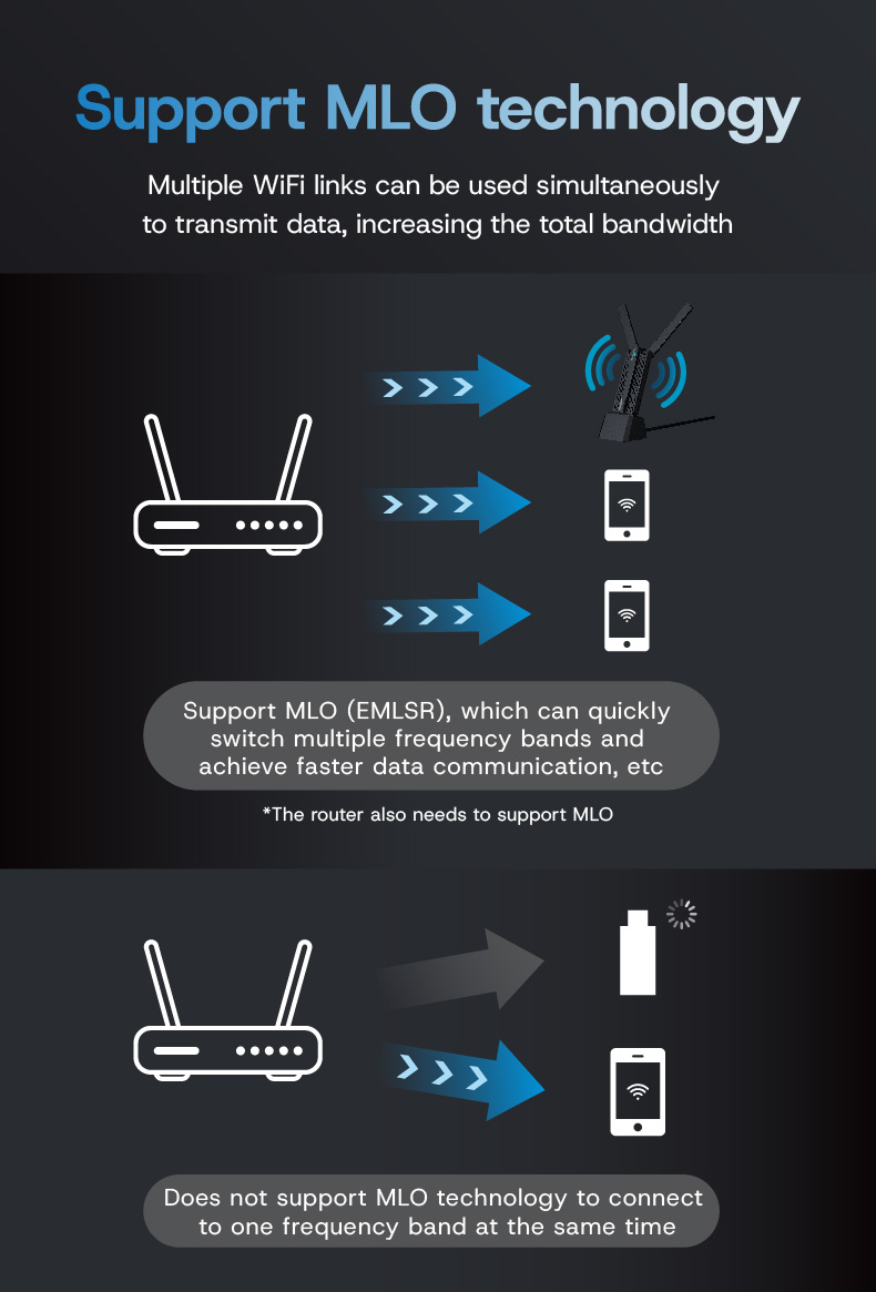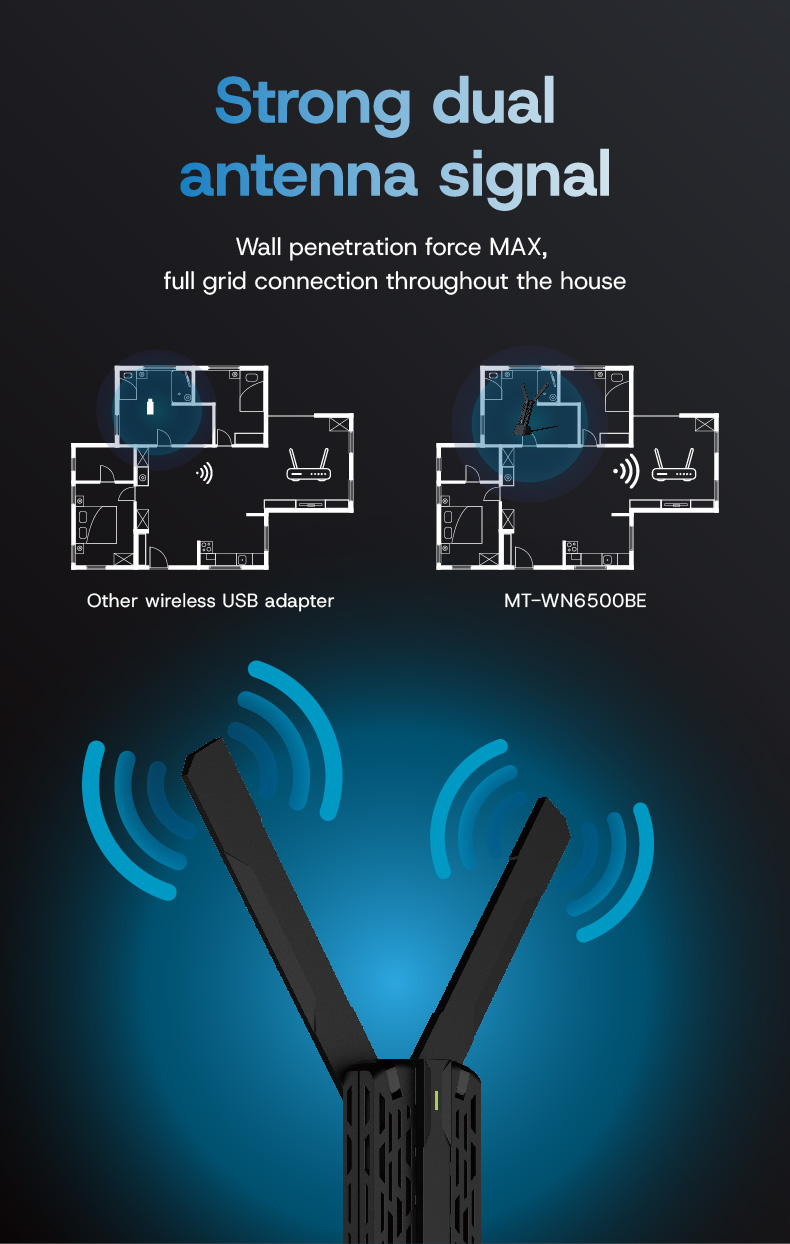 The MT-WN6500BE is a tri-band WiFi 7 USB wireless adapter that supports the 802.11BE protocol